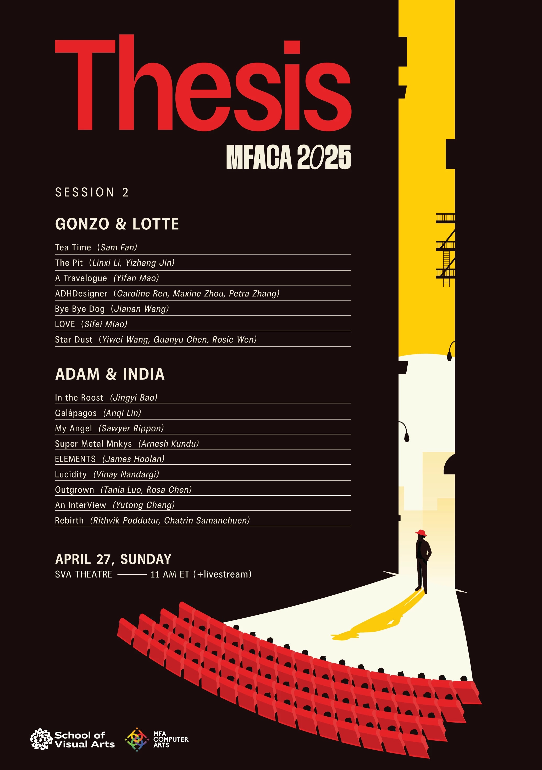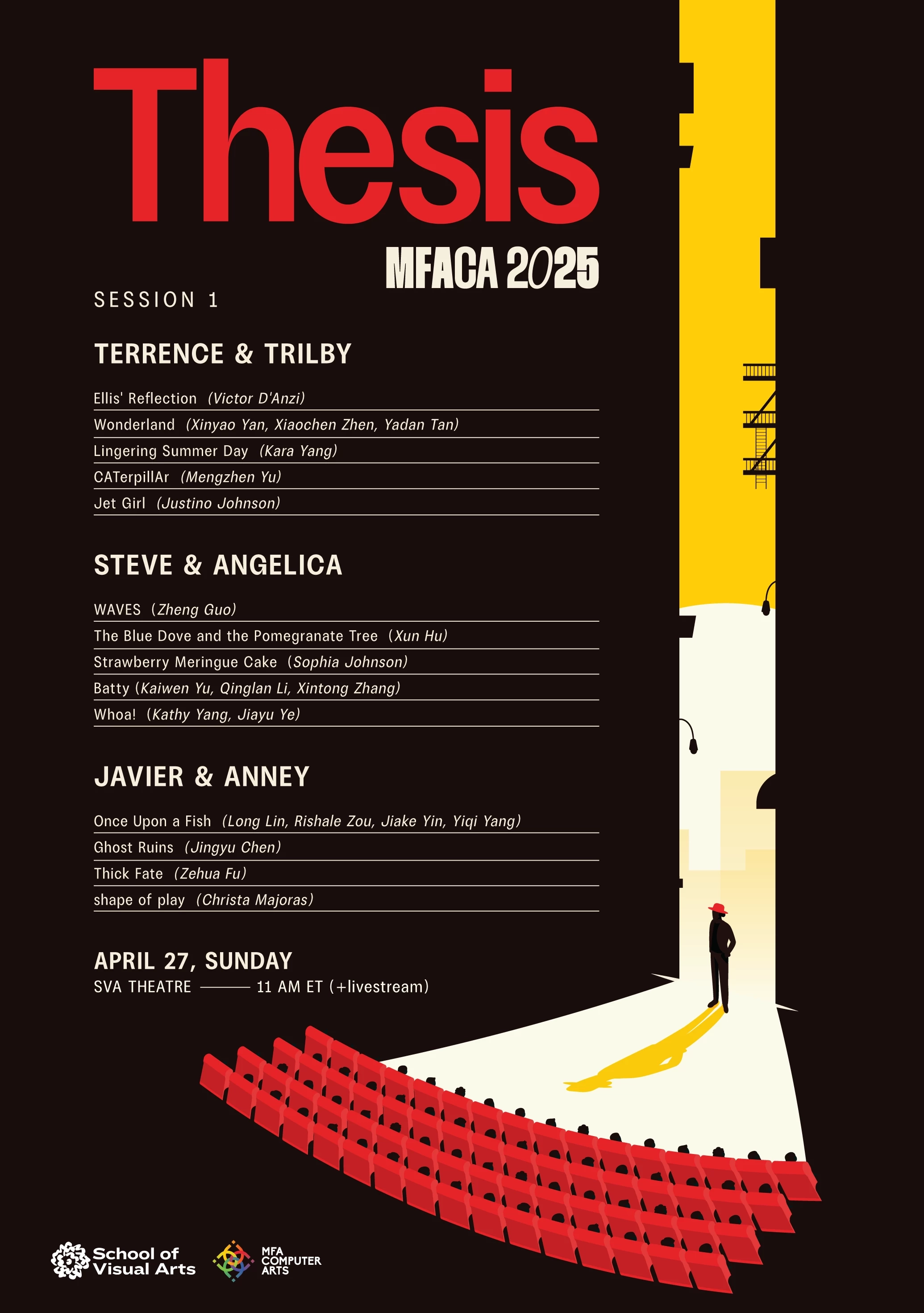 333 West 23rd Street, New York, NY 10011MFA Computer Arts presents this year’s thesis screening event featuring short talks and videos of work by graduating students. Run, don’t walk, to see the 3D animation, VFX, 2D animation, motion design, and experimental pieces by talented students!